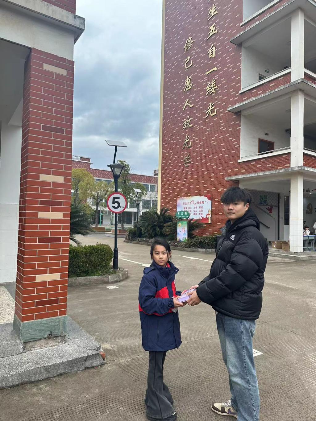 退役大學(xué)生們首先來到義烏市前店(雷鋒)小學(xué),與“當(dāng)代活雷鋒”、原義烏市政協(xié)二級調(diào)研員、學(xué)校校外人生導(dǎo)師金正洪一起慰問學(xué)生。他們詢問了小學(xué)生們的生活、學(xué)習(xí)情況,送上祝福與慰問品,并鼓勵他們成為社會有用之才,努力將雷鋒精神傳承下去,做太陽的一縷光。
