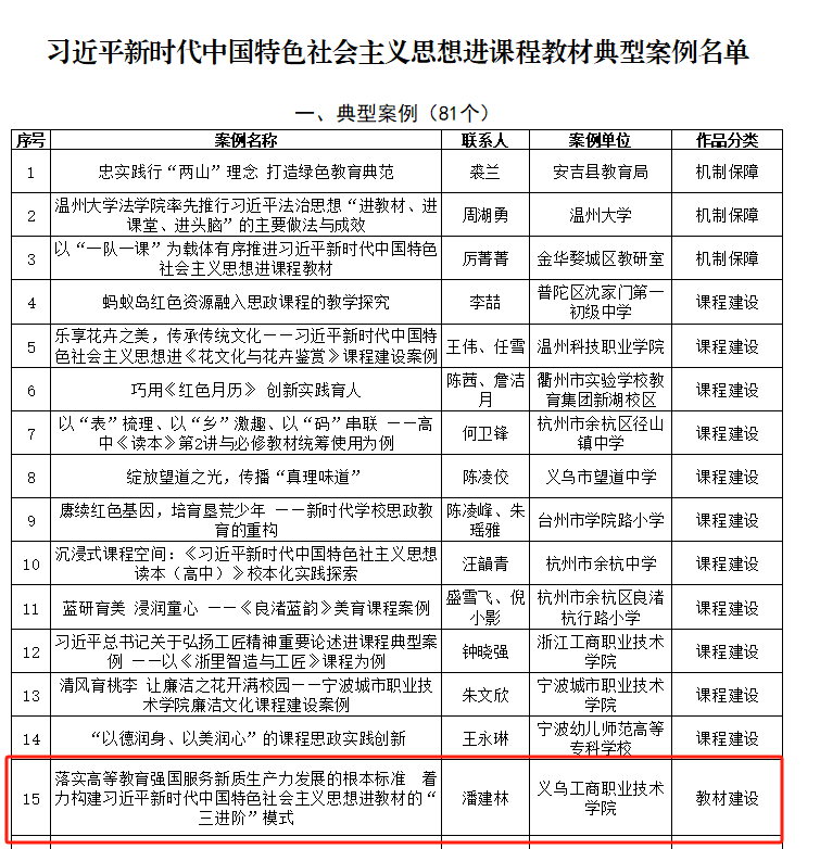近日,浙江省教育廳辦公室公布“習近平新時代中國特色社會主義思想進課程教材典型案例”名單,確定典型案例81個、培育案例128個,其中高職院校入選典型案例13個,我校潘建林教授《落實高等教育強國服務新質生產力發(fā)展的根本標準 著力構建習近平新時代中國特色社會主義思想進教材的“三進階”模式》案例成功入選典型案例。
