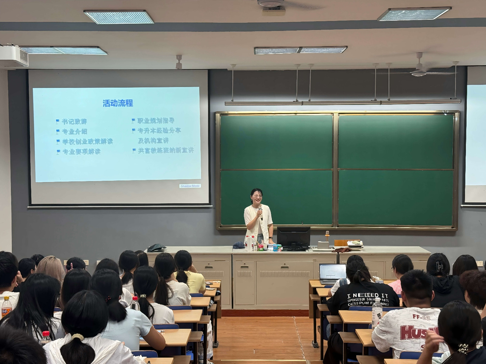 在專業(yè)核心模塊解讀環(huán)節(jié),專業(yè)主任系統(tǒng)介紹了金融服務(wù)與管理專業(yè)的培養(yǎng)目標、課程體系及特色實踐平臺,重點解讀了“產(chǎn)教融合、課證融通”的人才培養(yǎng)模式,并展示了往屆學生在省級職業(yè)技能競賽、專升本考試中的優(yōu)異成績。創(chuàng)業(yè)導師則圍繞學校“創(chuàng)新創(chuàng)業(yè)”政策體系展開解讀,詳細說明“創(chuàng)業(yè)園入駐條件”“項目孵化支持政策”“創(chuàng)業(yè)學分置換”等具體措施,鼓勵新生積極參與創(chuàng)業(yè)實踐,將專業(yè)知識轉(zhuǎn)化為創(chuàng)業(yè)動能。資深就業(yè)指導教師通過案例分析,為新生繪制了從“職業(yè)認知——能力提升——就業(yè)創(chuàng)業(yè)”的全周期成長路線圖;優(yōu)秀學長代表則以親身經(jīng)歷分享專升本備考策略,強調(diào)“早規(guī)劃、重基礎(chǔ)、勤實踐”的備考三要素,為新生提供可復制的升學經(jīng)驗。