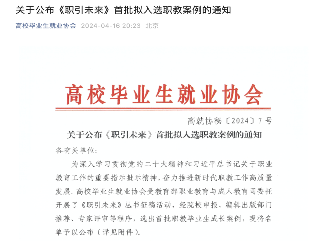 《職引未來》是高校畢業(yè)生就業(yè)協(xié)會受教育部職業(yè)教育與成人教育司委托所開展的職教案例征集活動,經(jīng)院校申報、編輯出版部門推薦、專家評審等程序,選出首批職教畢業(yè)生成長案例。案例體現(xiàn)了職業(yè)教育的典型性,詮釋了勞模精神、勞動精神和工匠精神,進一步推動新時代職教工作高質(zhì)量發(fā)展。